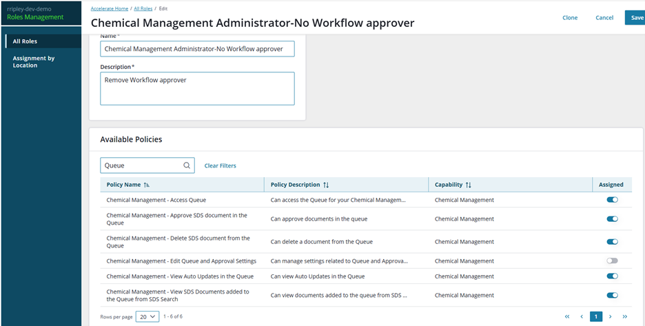 - For site-specific workflows: To access the Queue and Approval page to approve documents at a location, users must be assigned a role with the Chemical Management – Workflow Approver policy at the location where the document is being requested.