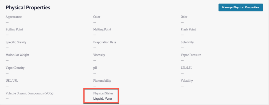Tracking and reporting product inventory amounts requires you to first create Locations, assign products to Locations, create Containers within Locations, and index certain Physical Properties that appear in Section 9 of the Safety Data Sheet (SDS).