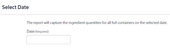 The report must be run for a specific date and will capture the ingredient quantities for all Active containers on that date.