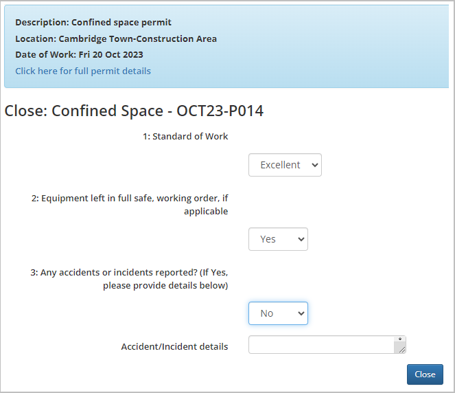You may be required to respond to questions to verify that the necessary work is complete before the permit can be closed. When you’ve answered all questions, select Close. Once a permit is closed, no further actions or modifications can be performed on it.