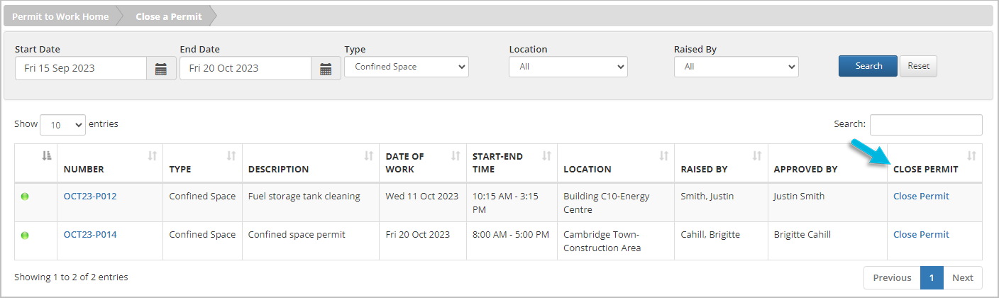 In this section, you can view all permits that are eligible for closure. Apply filters based on Date, Permit Type, Location, or the Permit Raiser to refine your search.