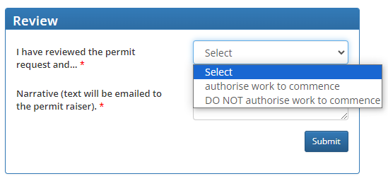 Select an option from the following and a note for the permit raiser, and then select Submit. You may also be required to provide a digital signature in order to complete this step.