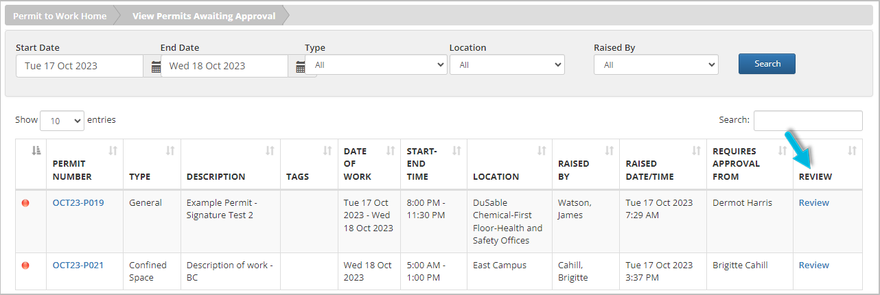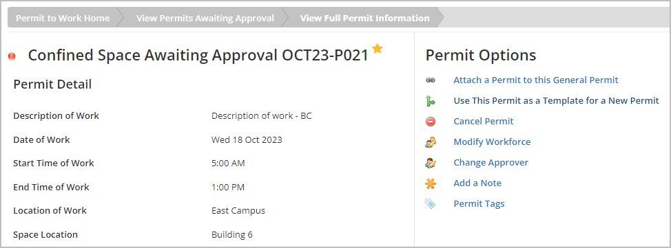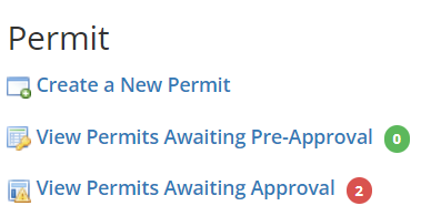 The designated Permit Approver can access the permit by navigating to View Permits Awaiting Pre-Approval/Approval and then selecting Review next to the permit to display the full permit details.