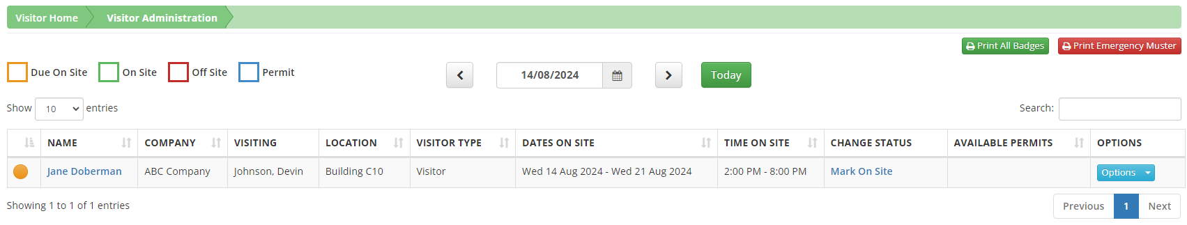 Visitor Administration is an important tool you can use to manage and review all visitors and their status. From this page, you can make changes to a visitor’s status. You can also access the visitor’s profile to obtain details specific to them and their visit. If you have the Permit to Work Module, you can also see if the visitor is associated with any permits and the specific permits themselves. In this document, we will dive into the various features available in this section. For details about an individual Visitor Profile, refer to Visitor Profiles.