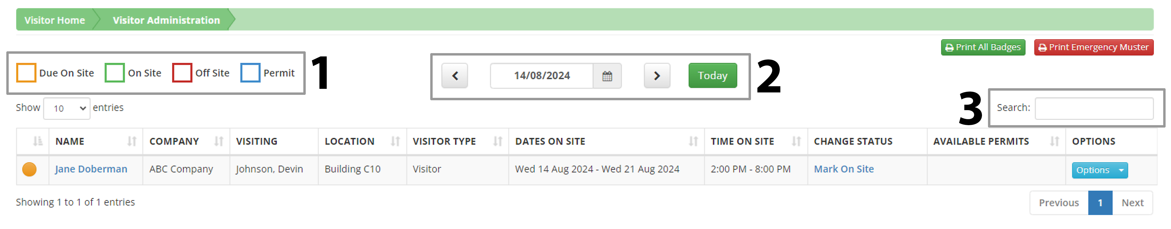 - Status checkboxes. Located at the top left of the page, this area provides a legend to indicate the status of visitors. Select a checkbox to show visitors with that status.