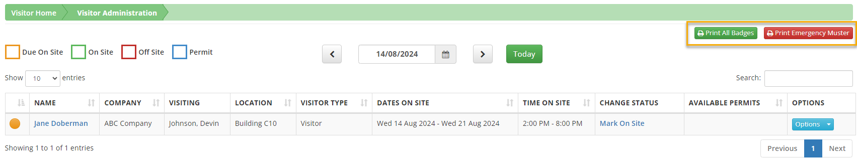 Note: The template used for badges is specific to your company. For template changes, contact Customer Support. - Print Emergency Muster. Print a list of all visitors on site at the date and time of printing to assist with emergencies.