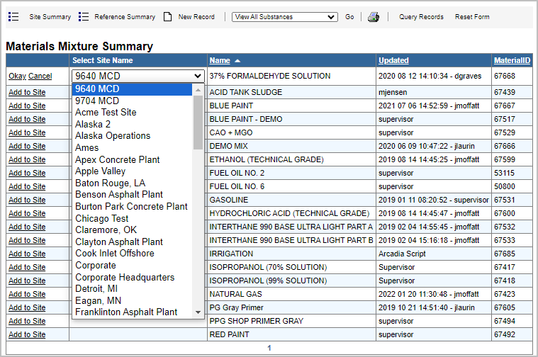 - Find the mixture to which you want to associate a location and select Add to Site.