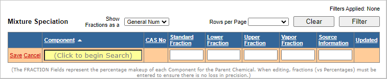 - In the Component column, fill in the chemical. (This column includes type-ahead search.)