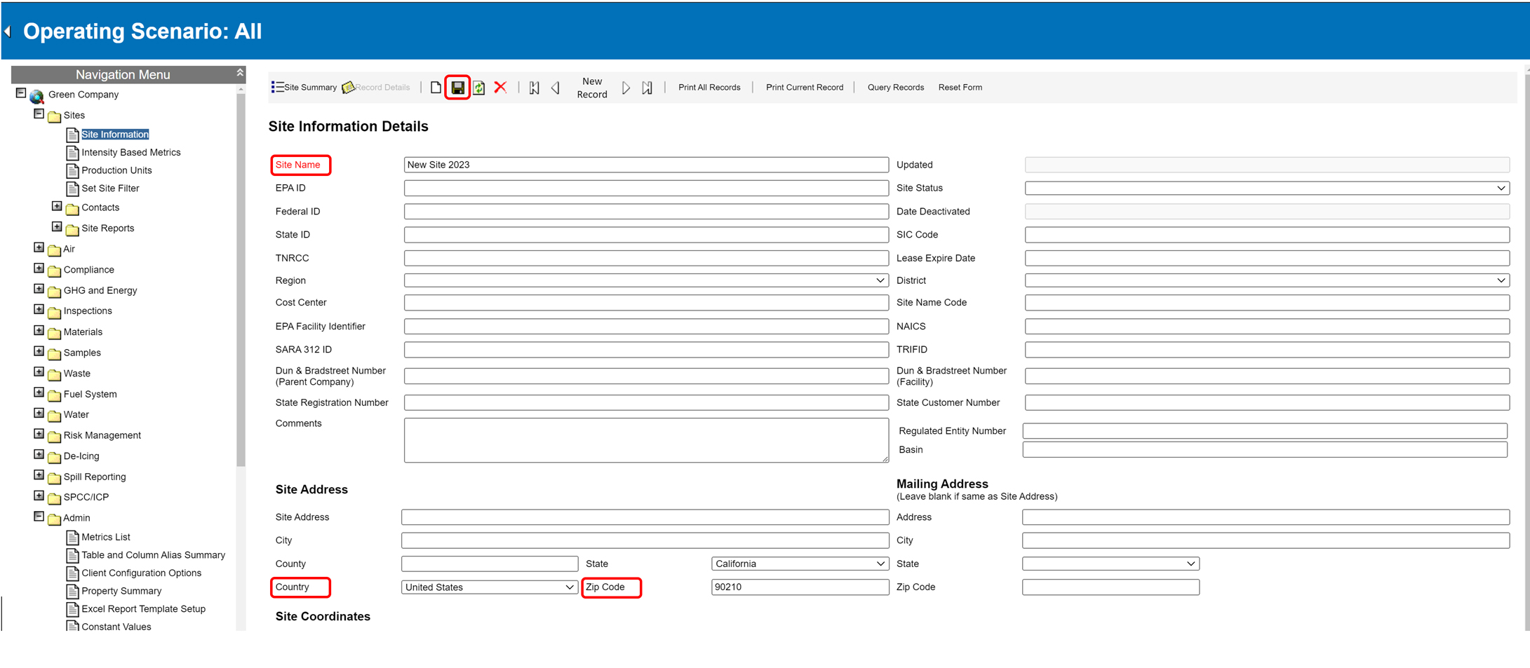 - To complete the form for a new site, enter the Site Name and any other available information about the site. Provide the following information at a minimum: