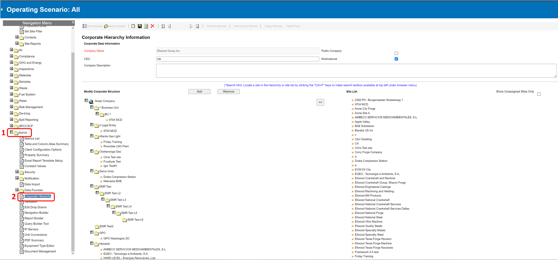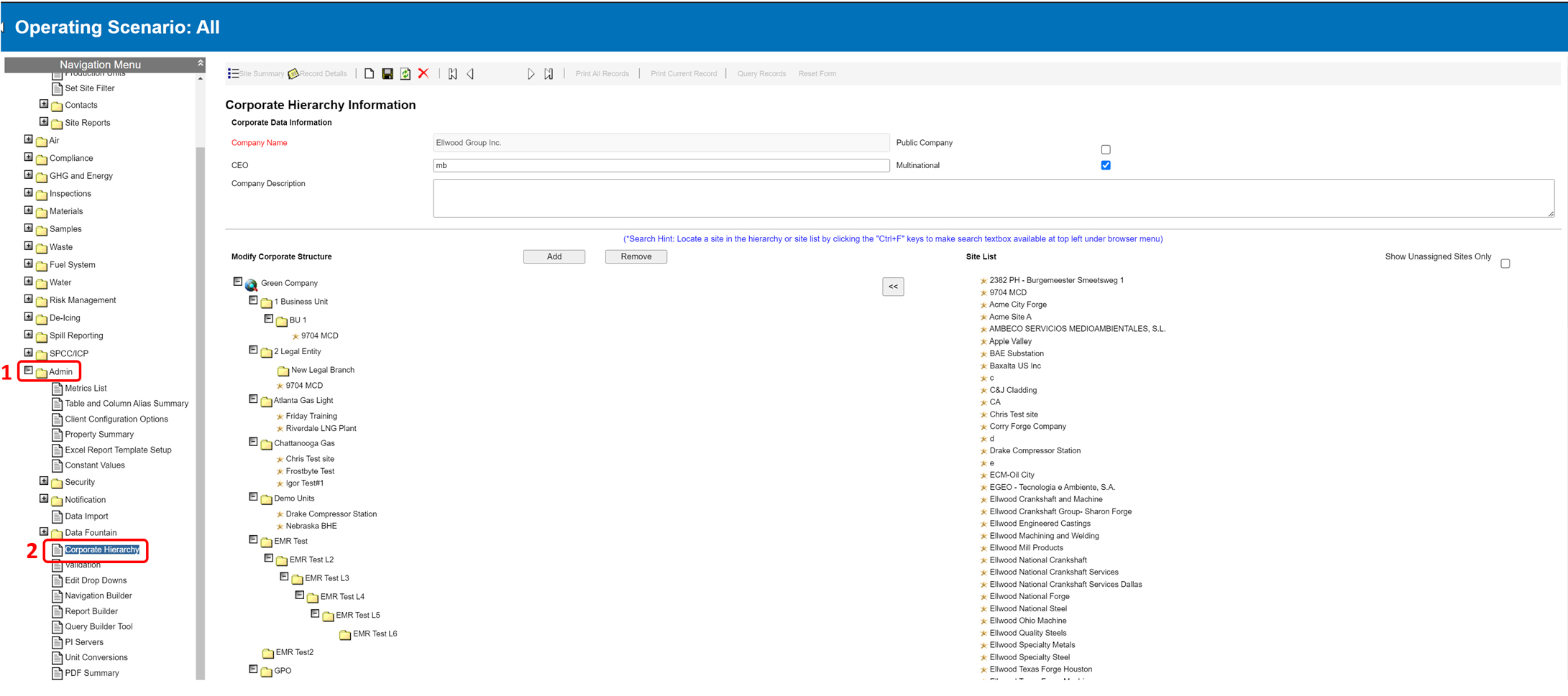 - From the Navigation Tree, select Admin → Corporate Hierarchy.