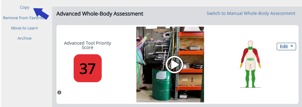 Copying an assessment is useful when assessing similar tasks with overlapping components that can be easily adjusted, for example, when two workstations are set up the same way, but the product size or weight varies slightly. The copy function enables you to selectively copy photos and videos, the baseline analysis score, direct causes, improvements, projected analysis, and the follow-up analysis.