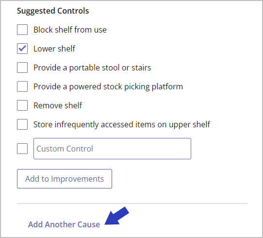 - Based on the cause(s) you selected, you’ll see a generated list of Suggested Controls (improvements) you can implement to reduce the risk for this body region. If you’d like to apply any of these, select them and then choose Add to Improvements to automatically add them to the Improvements phase. You can also add a custom control here. Note that no Suggested Controls are provided for “Other” causes you may have entered, but you can enter a Custom Control here instead.