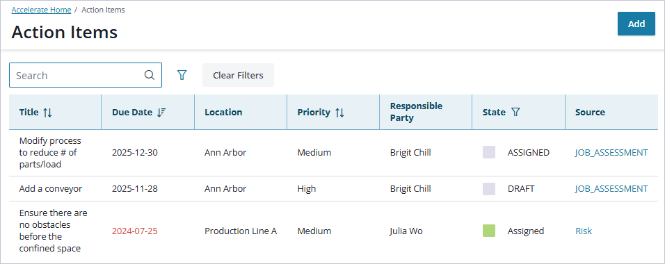 Changes made to improvements are kept in sync between the job assessment record and the Action Items page, which reflects updates at key moments in the life of the improvement (when it’s assigned, when the status or priority changes, becomes overdue). For example, when a Responsible Person marks an improvement complete in a job assessment, the related action item on the Action Items page reflects that status change.