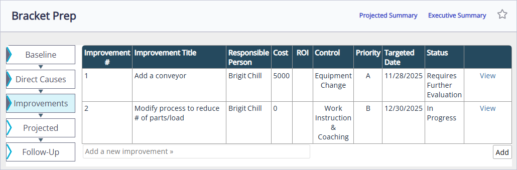 The description that you entered in the “add a new improvement” box will become the improvement title. To edit your improvement and add additional information, select View on the right side of the table.