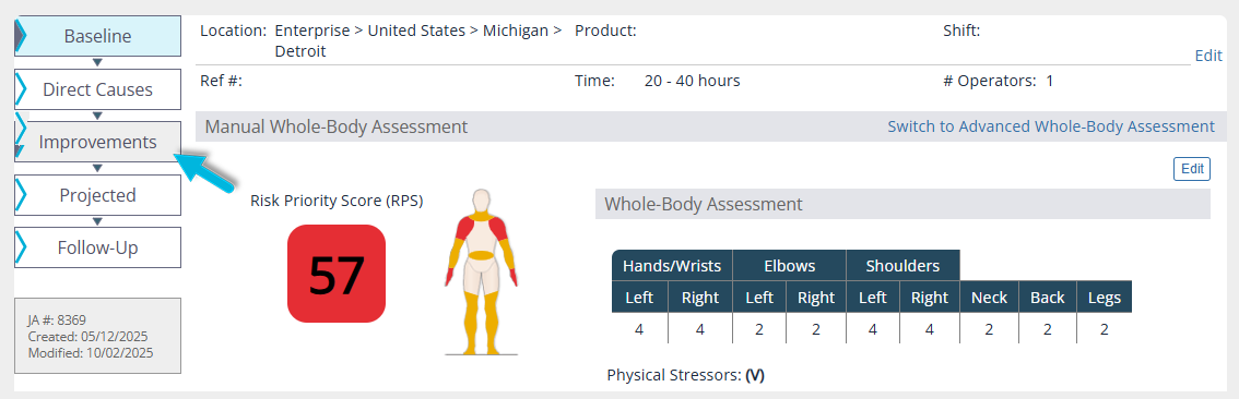 After adding Direct Causes, navigate to Improvements on the left side of the page. To learn more, see Adding Improvements to a Whole-Body Assessment.