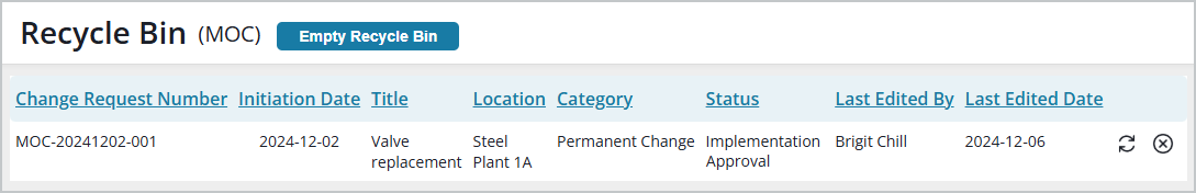 To access the MOC Recycle Bin, select Operational Risk > Management of Change > Admin Settings > Recycle Bin from the Navigation menu.