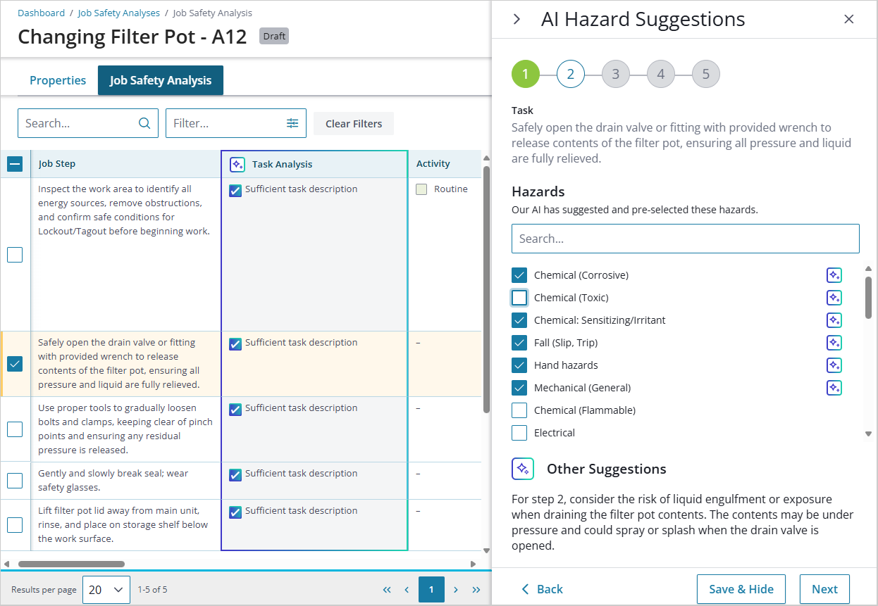 - JSA Step Task Analysis – Reflects AI-suggested task descriptions so that you can see the original descriptions, what was suggested, and the subsequent changes made as a result.