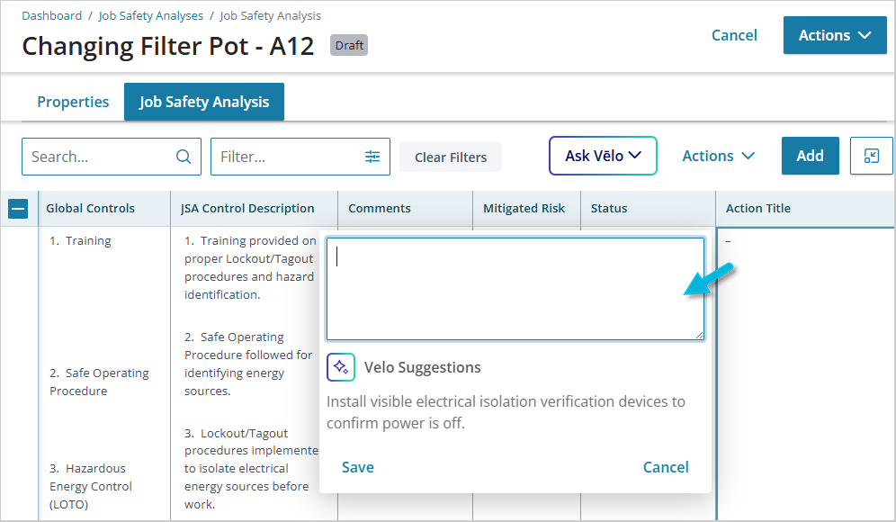 This article describes how to edit a Job Safety Analysis (JSA) using AI features (Ask Vēlo) in Operational Risk on Accelerate. The AI features are available only for Accelerate customers who have purchased this option.