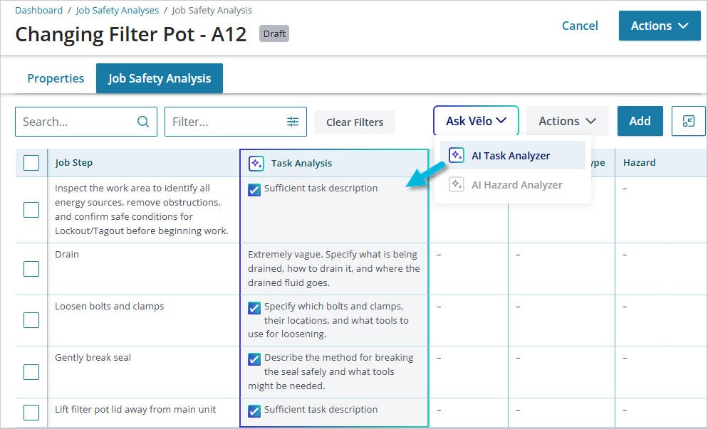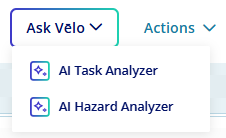 Once you have solid task descriptions, you’re ready to identify potential hazards that may exist for each of them. Select Ask Vēlo > AI Hazard Analyzer to use AI to help you get started.