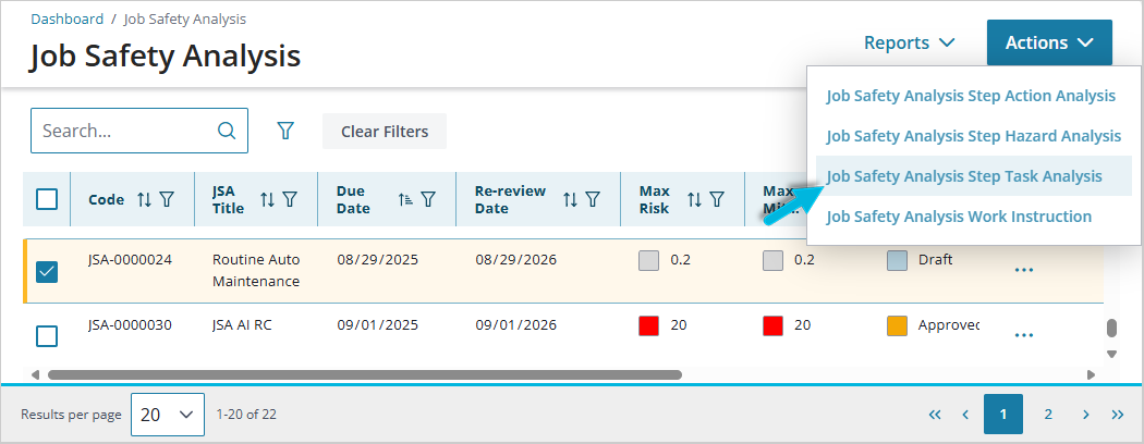 To run the reports, select the JSA(s) you want to include on the Job Safety Analysis page, and select Actions > (report name).