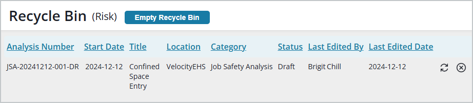 Using the Recycle Bin, administrators can view and work with JSA, Aspects and Impacts, and HAZOP analyses that have been deleted from within the Standard Job Safety Analysis capability.